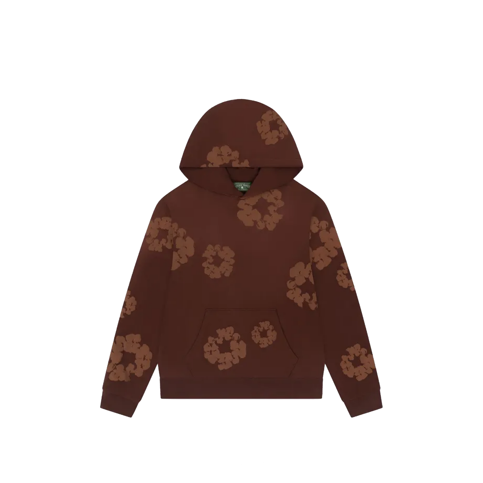 The rich brown colorway features the iconic tonal cotton wreath logo across the chest, representing heritage and resilience. Functional details include a drawstring-adjustable hood, ribbed cuffs and hem, and a spacious kangaroo pocket, making it both meaningful and versatile.